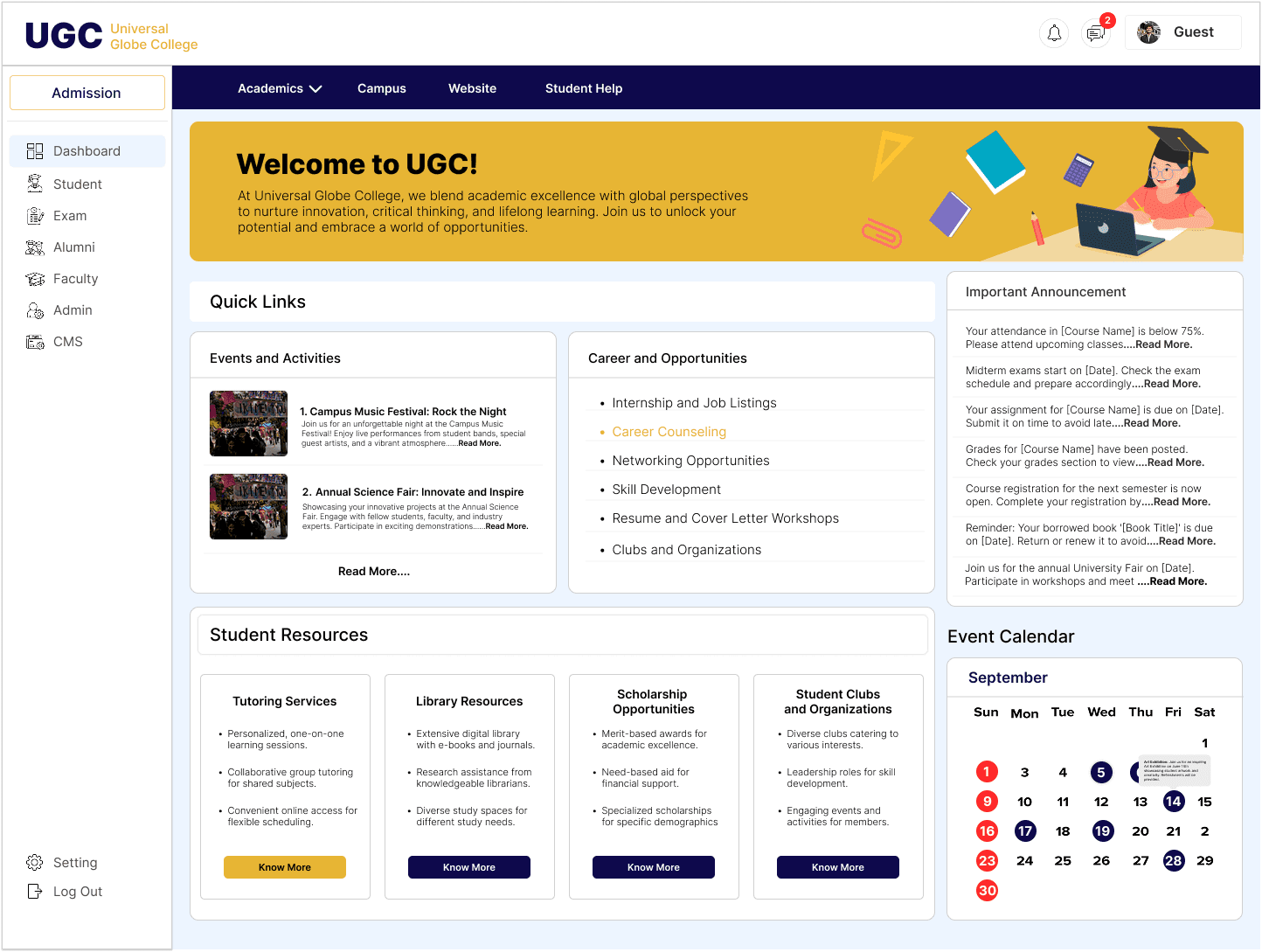 UGC University is a global education institution focused on accessible, modern learning. We designed a streamlined digital portal that simplifies admissions, manages student records, and enhances communication across departments. The result is a smoother academic experience and a stronger digital presence for the university.